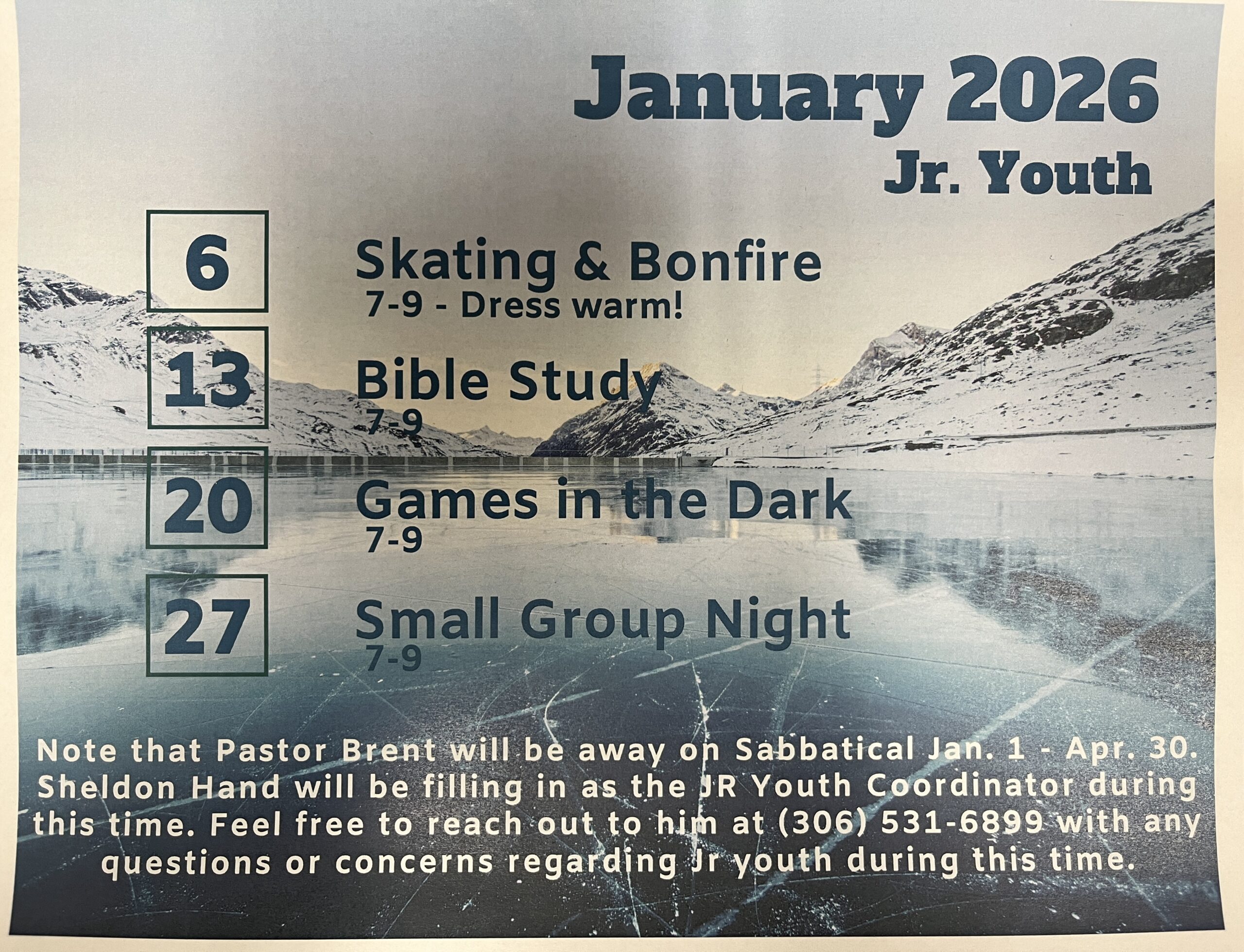 Pastor Brent is away on Sabbatical Jan 1 2026-April 30 2026 so he will not be available however feel free to contact our Sr Youth Coordinator -Josiah Gibson 1-778-855-4281 or our Jr Youth Coordinator -Sheldon Hand 1-306-531-6899